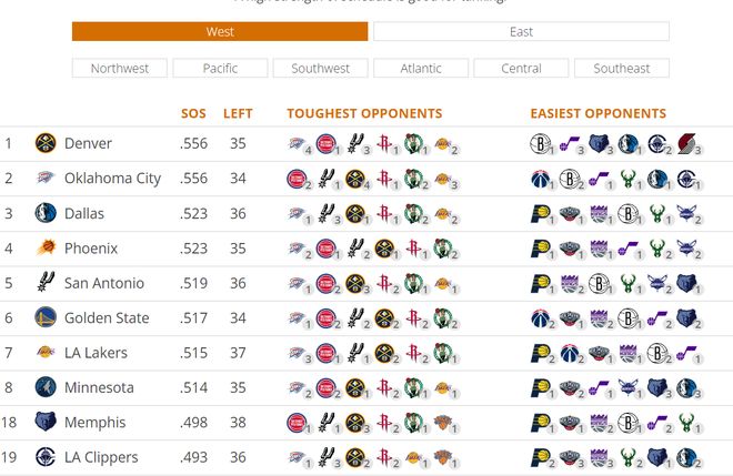 快船余下的36場(chǎng)比賽對(duì)手平均勝率僅為49.3%,排在西部倒數(shù)第六,換言之快船余下的賽程是西部第六輕松的,掘金余下的賽程最難,灰熊、勇士、獨(dú)行俠、太陽(yáng)作為快船沖擊西部前六的競(jìng)爭(zhēng)者余下的賽程都更難。