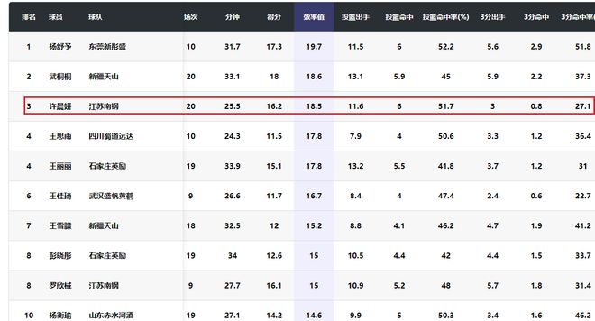 在本土球員籃板榜上,許晨妍以場(chǎng)均搶到6.9個(gè)籃板排名第一。在本土球員效率值榜上,楊舒予以19.7排名第一,武桐桐18.6位居第二,許晨妍18.5排名第三,王思雨和王麗麗都是17.8并列第四。很顯然,許晨妍是本賽季效率值最高的中鋒。相比之下,陳明伶效率值13.7排名本土球員第14位。劉禹彤效率值13.2排名本土球員第16位。
