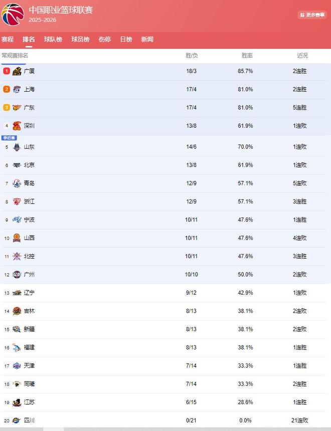 CBA25-26賽季常規(guī)賽,正在火熱進(jìn)行中,各支球隊為了排名和季后賽而努力奮戰(zhàn),比賽打的也是精彩不斷,逆轉(zhuǎn)、爆冷那是時常發(fā)生,排名也在隨時發(fā)生變化!在第21輪比賽打完后,上海登上第2,北京隊5,山東殺進(jìn)前4,6隊展開第12名的爭奪!