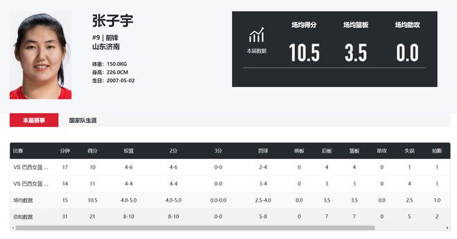 對(duì)陣巴西女籃的兩場(chǎng)比賽,張子宇都是替補(bǔ)登場(chǎng),第一場(chǎng)替補(bǔ)17分鐘,6中4拿到10分4籃板1搶斷,第二場(chǎng)替補(bǔ)登場(chǎng)14分鐘,4中4+罰球4中4拿到11分3籃板,效率值都非常之高。