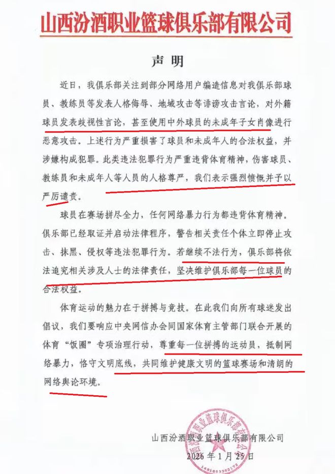 從山西隊聲明內(nèi)容顯示:俱樂部已經(jīng)關(guān)注到一些網(wǎng)絡(luò)用戶,針對山西隊球員、教練員等人,發(fā)表了一些地域攻擊、人格侮辱等誹謗攻擊言論,以及對山西隊外援發(fā)表了歧視性言論……對于這些言論,山西隊表示強(qiáng)烈憤慨,同時,進(jìn)行嚴(yán)厲譴責(zé)。