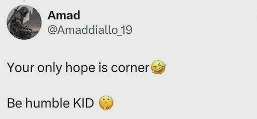阿森納被阿瑪?shù)伦プ×恕鞍驯薄K谏缃幻襟w上回復(fù)一位賽前豪言“阿森納4-0贏了我已拿到劇本”的球迷:“你的唯一希望就是角球”“低調(diào)點(diǎn)吧,小子”,并曬出3-2終局比分截圖配文:“享受去吧,臭小子”。