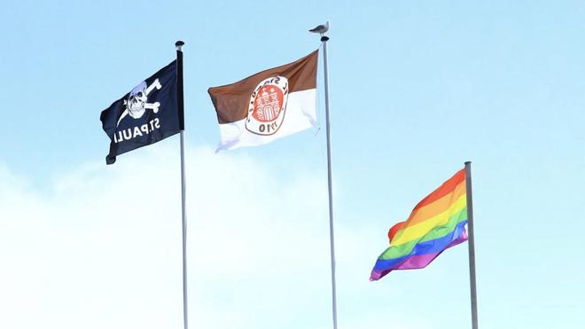 骷髏旗已與圣保利的隊(duì)徽一樣,成為俱樂(lè)部的標(biāo)志性符號(hào)。圣保利還以反對(duì)歧視為榮,米勒托爾球場(chǎng)外常年飄揚(yáng)著彩虹旗。