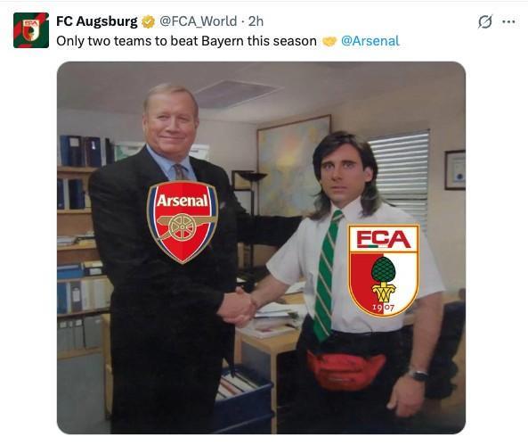 德甲第19輪,奧格斯堡客場(chǎng)2-1戰(zhàn)勝拜仁慕尼黑。賽后奧格斯堡官方社媒曬和阿森納握手梗圖,并表示:“本賽季只有兩支球隊(duì)能擊敗拜仁?!蓖瑫r(shí)艾特了阿森納。