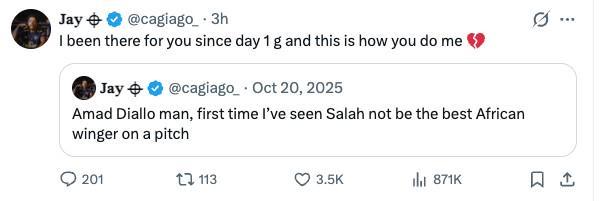 隨后該槍手球迷轉(zhuǎn)發(fā)他此前在2025年10月發(fā)布的一篇帖子,該帖子內(nèi)容是:阿馬德-迪亞洛,兄弟,這是我第一次看到薩拉赫在同一塊場(chǎng)地上不再是表現(xiàn)最好的非洲邊鋒。