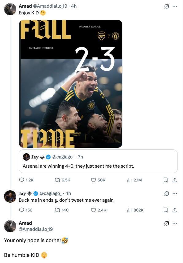 阿馬德和賽前預(yù)測(cè)4-0的槍迷斗嘴:你們唯一指望就是角球