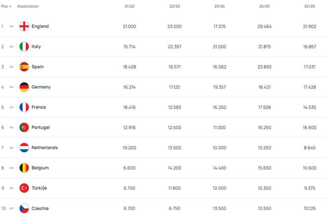 目前的歐戰(zhàn)積分中,英格蘭21.902分斷檔領(lǐng)先,德甲、西班牙、意大利和葡萄牙分列2-5位,法國排在第6。